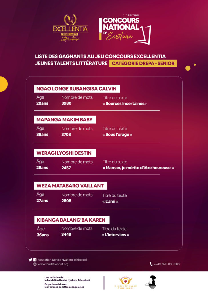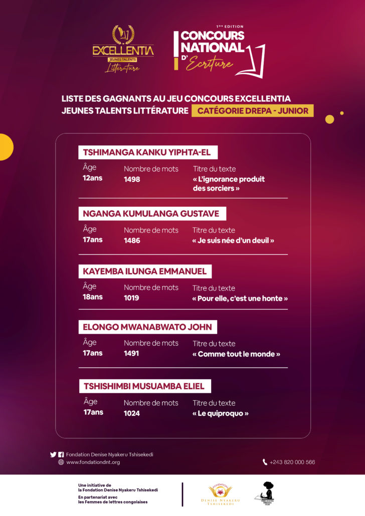 Conformément à son engagement pour la promotion de l’excellence en République démocratique du Congo, la Fondation Denise Nyakeru Tshisekedi lance la première édition du programme EXCELLENTIA JEUNES TALENTS LITTERATURE pour mettre en valeur nos talents passionnés par la plume.