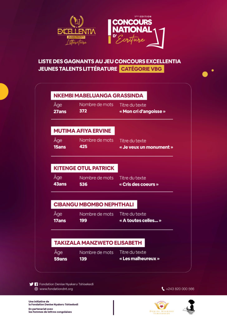 Soucieuse de répondre à son engagement en ce qui concerne la promotion de l’excellence en RDC, la Fondation Denise Nyakeru Tshisekedi en partenariat avec FELCO (les Femmes de Lettres Congolaises) organise un concours national d’écriture dénommé EXCELLENTIA JEUNES TALENTS LITTÉRATURE, une branche de son projet EXCELLENTIA. Ce concours permettra de sensibiliser sur la maladie génétique qu’est la drépanocytose et sur les violences basées sur le genre tout en mettant en valeur nos talents littéraires congolais Junior et Senior passionnés par la plume.
